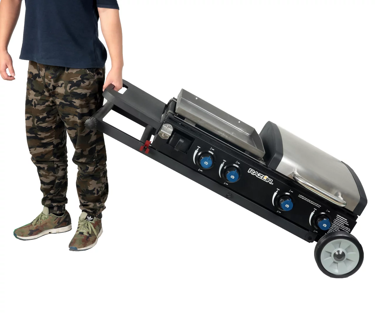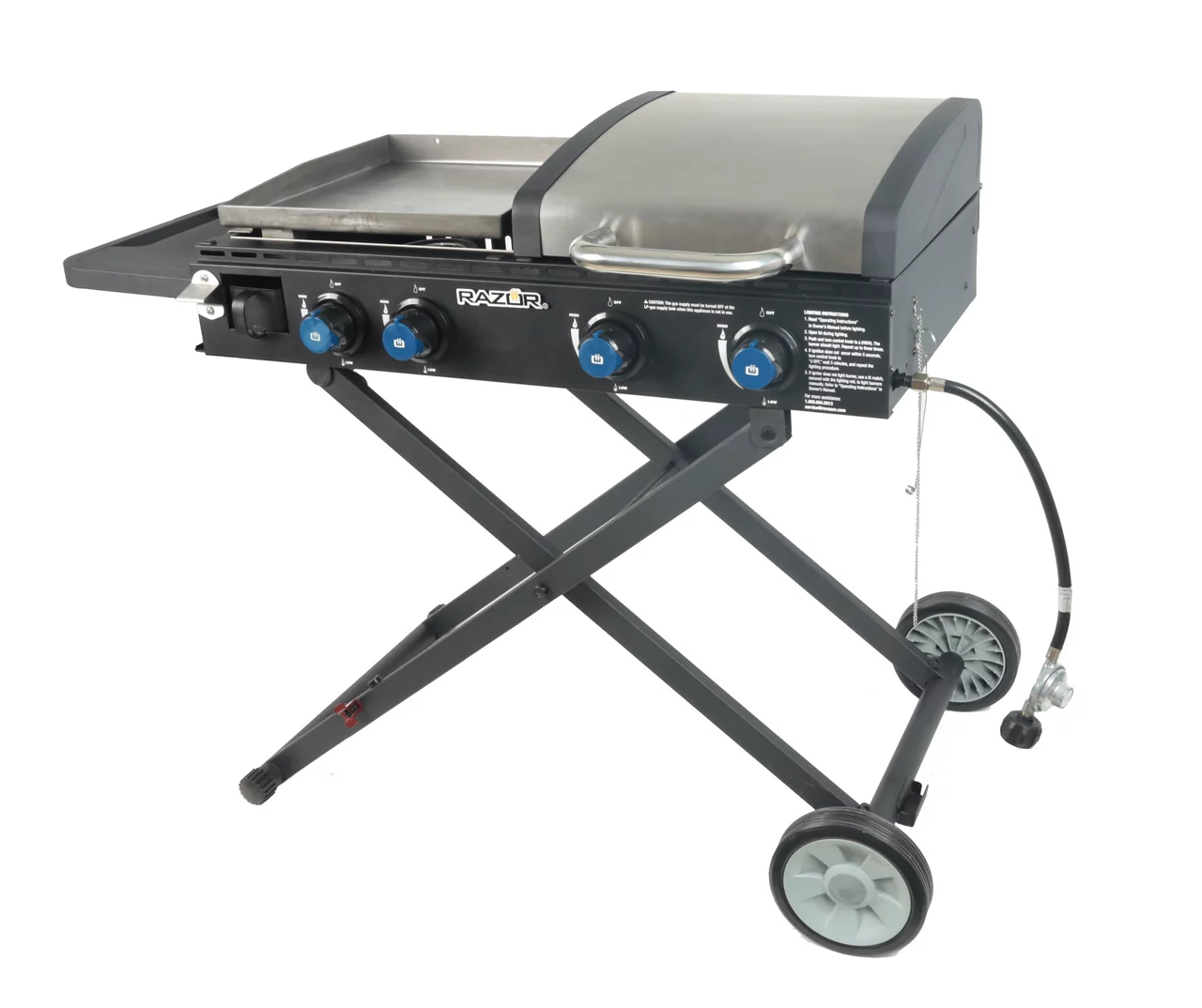 The Razor four-burner folding gas grill and griddle combo delivers two-in-one experience. With 512 square inches of cooking area, the powerful burners bring a total 44,000 BTUs of heat output to your barbecue favorites. The side shelf offers extra space for food preparation as a secure front access drain and cup provides easy grease disposal. Versatile surface for cooking breakfast, lunch and dinner. The unique mobile cart design makes it easy to fold for storage or transportation. One steel lid on the grill protects and shelters your savory meal from unexpected, incoming weather while steaming foods or melting cheeses.