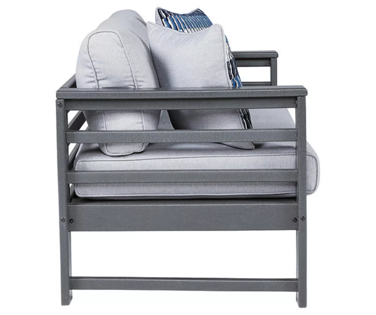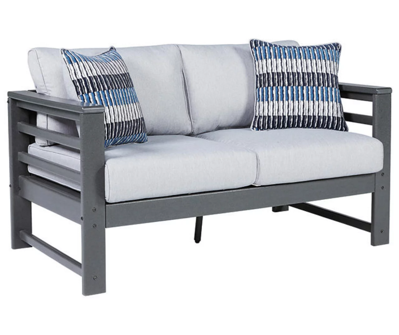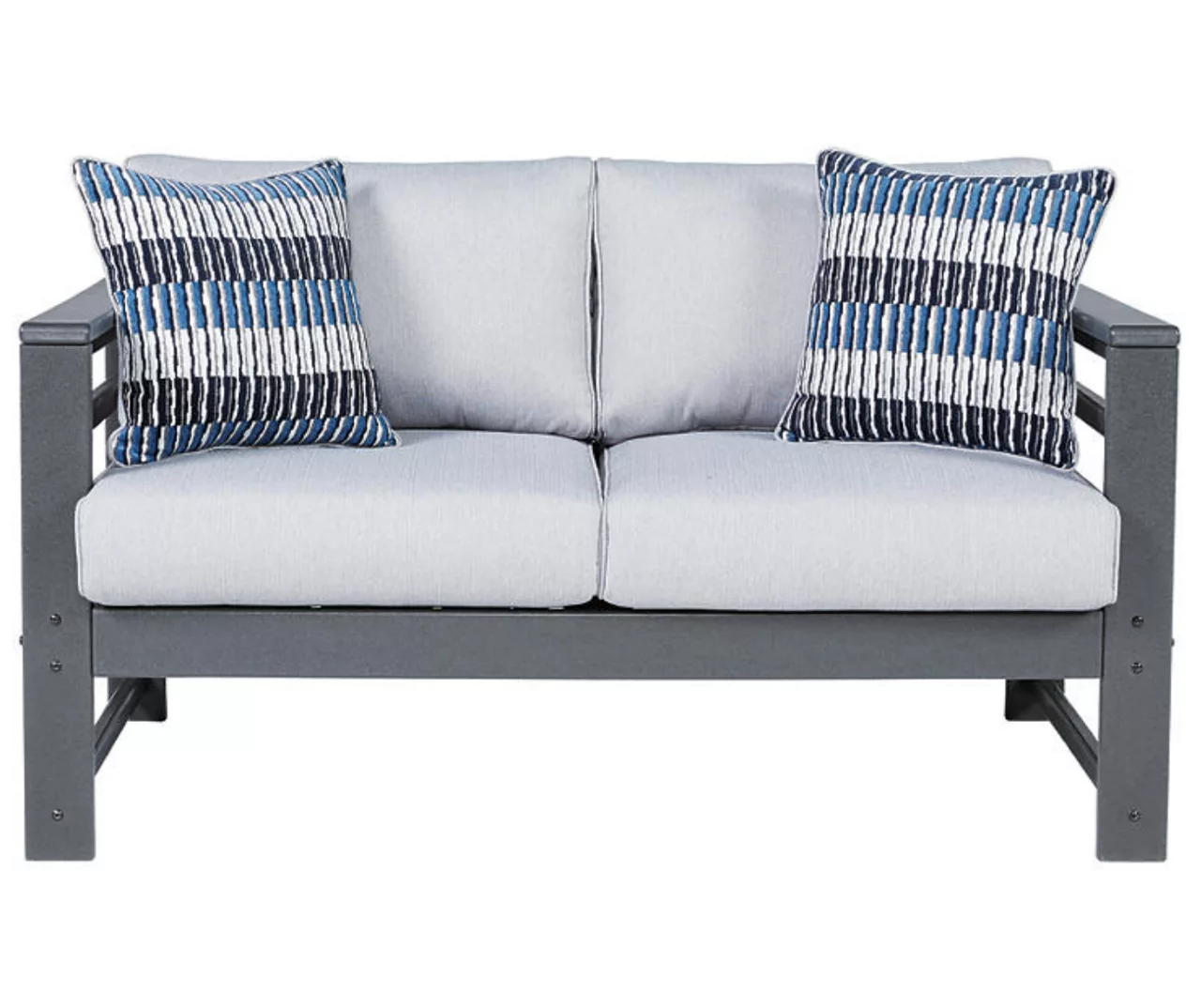 Indulgently comfortable furniture shouldn’t be limited to inside spaces. Create your own outdoor oasis with this cushioned loveseat. A study in form and function, the trend-right charcoal gray frame is crafted from Mega Tuff HDPE material for durability and weather resistance. Cushions wrapped in high-performing Nuvella fabric are comfortable and carefree.
