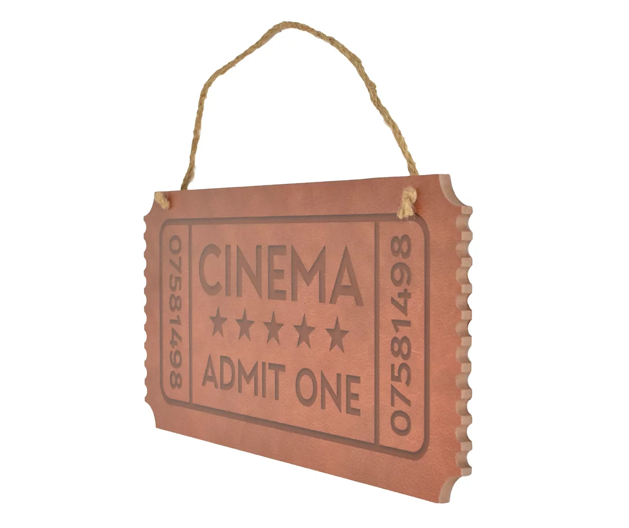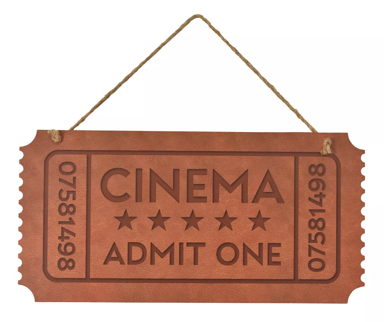 Complete your home theater or entertainment room with the charming film-themed design of this wall plaque featuring a ticket-shaped design with a brown finish.