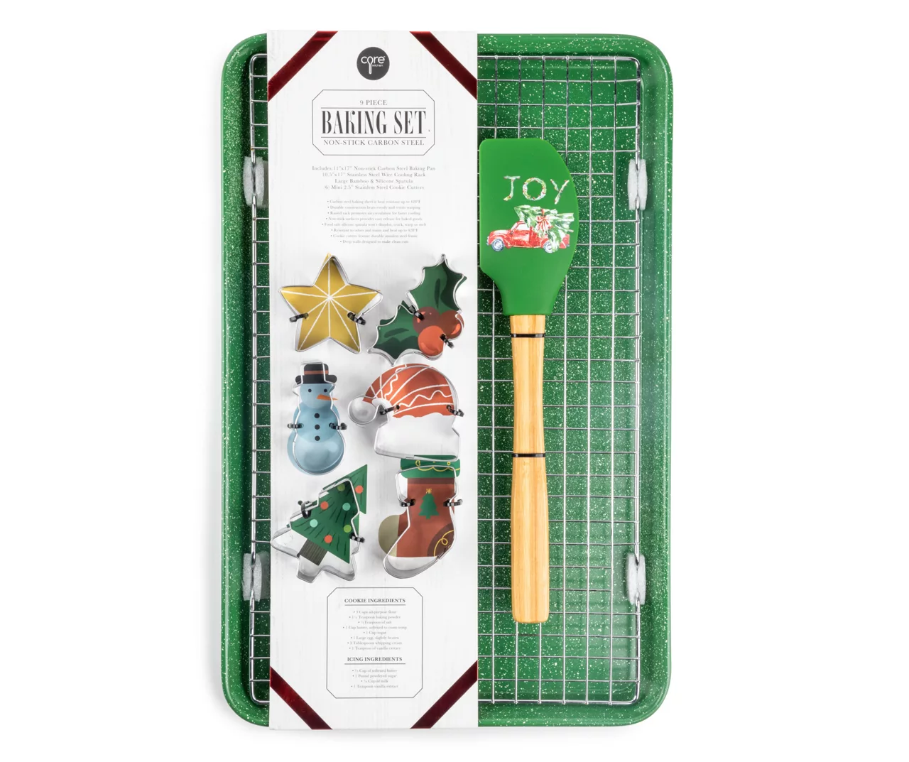 Inspire your next bath of holiday cookies or delicious casserole with this coordinated baking set. The beautiful speckled baking pan sports reliable steel construction while the non-stick coating makes cleaning easy. For everyday cooking, the silicone spatula sports a festive holiday truck design to inspire seasonal splendor with each use. With six charming designs, the mini stainless steel cookies cutters deliver reliably clear impressions in all kinds of dough.