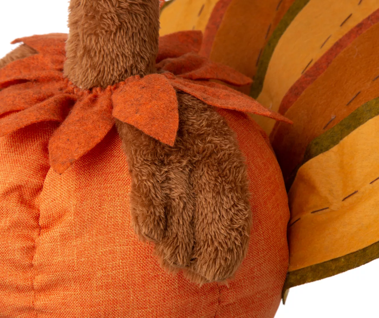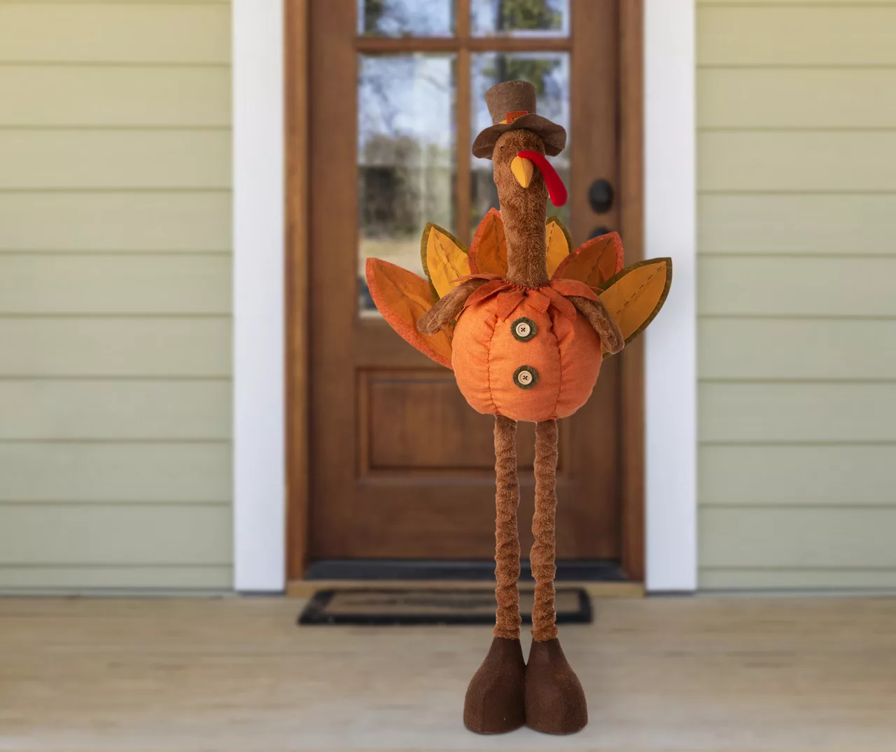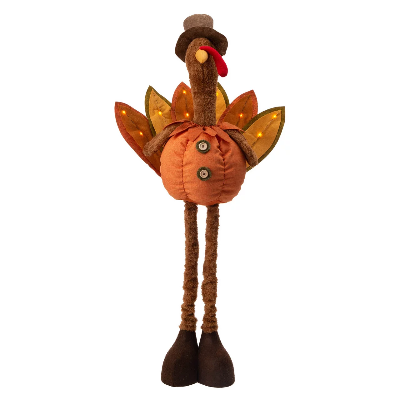 This adorable turkey welcomes festive fall design to your home! Featuring a plush pumpkin body with leaf feathers and a pilgrim hat, his telescoping legs allows you to adjust his height. He’s a charming seasonal addition to a living space or entryway.
