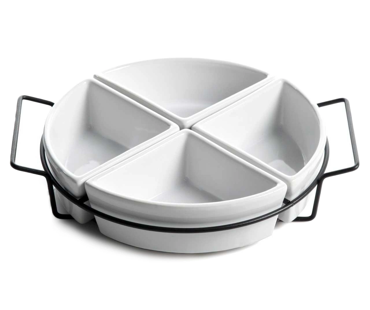 Four sections make up a pie in dishes that house different foods, snacks or toppings. The four triangle-shaped pieces sit inside of a sturdy metal frame featuring handles for carrying. This set is a fabulous addition to a dinner party or great for every day use.