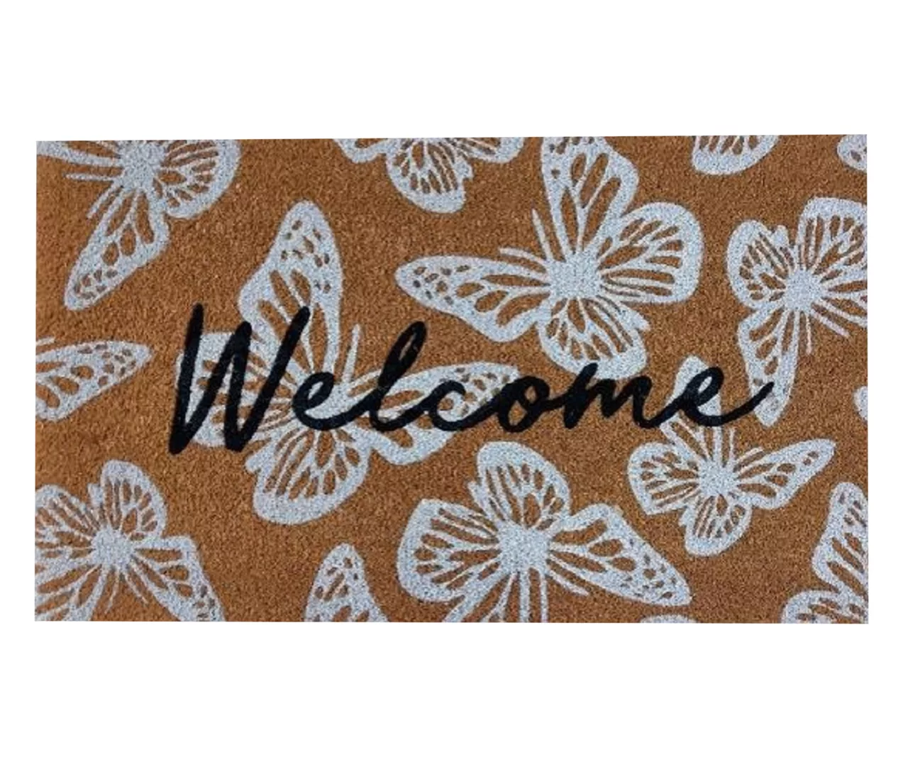 - “Welcome” message on the doormat with a butterfly pattern