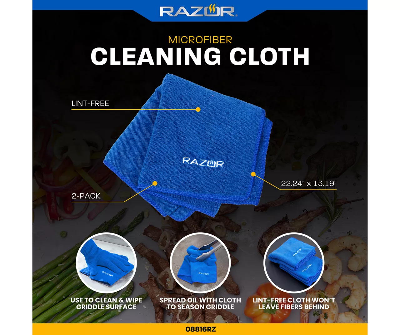 With the Razor microfiber cloths, you’ll never have to worry about lint on your griddle. Includes two microfiber cloths so you’ll never be without a clean griddle. The smooth microfiber material keeps lint off your cooking surface and is machine washable for little fuss. They can even be used to spread oil over your griddle for perfect seasoning.